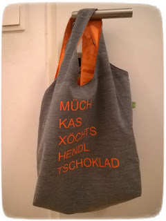 Für meinen Bruder und seine Frau, die das Wienerische beide mögen, habe ich eine Einkaufstasche nach dem Schnitt der "wendigen Louisa" aus dem Buch "Tolle Taschen selbst genäht" gezaubert. Den Text habe ich in Anlehnung an alle derzeit im Netz kursierenden T-Shirts mit Dialektausdrücken selbst aus Flockfolie geplottet.